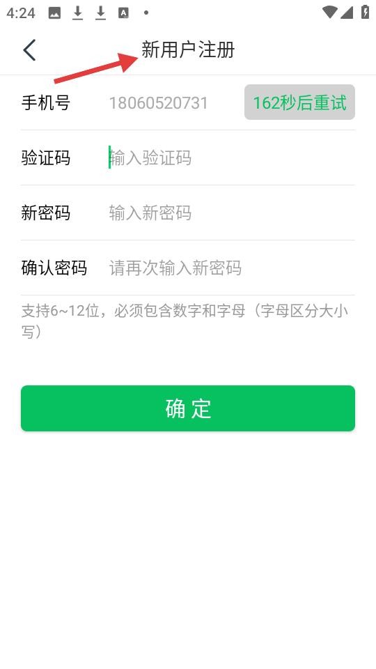 3、点新用户注册页,需依次填写手机号、验证码、新密码等信息,按要求设置后点击确定注册。