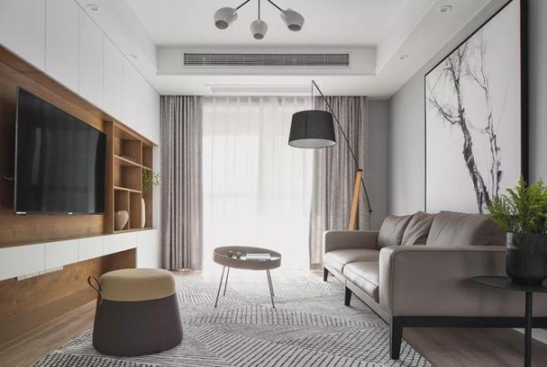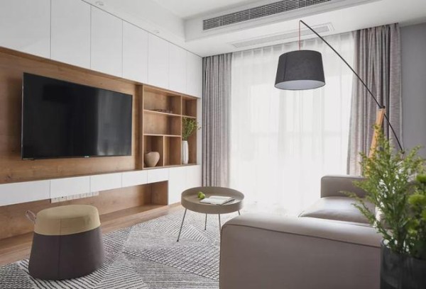 ▲电视墙是一个定制柜打造的设计,木质柜体+白色柜门的设计,整体设计显得简洁舒适自然。电视机右侧留空的几个格架,也是可以用于摆放陶艺花瓶或书籍,方便美观而惬意。