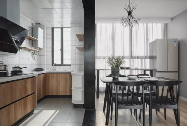 ▲改造后把厨房门扩大,并以开放式的餐厨格局,在餐厅厨房之间隔了一个黑色不锈钢包边的门框。餐桌与厨房平行布置,整体用餐空间体验得到了提升,黑色实木餐桌也是显得端庄而舒适。在靠窗位置的冰箱旁安装了一个小吧台,为居家提供了小情趣。