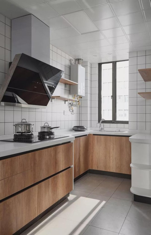 ▲厨房改造后在哑光灰地砖基础,搭配白色小格墙面砖,还有红橡木橱柜,为了保证水槽区域的活动,侧边操作台装成进深较小的,整体厨房小巧而又实用。