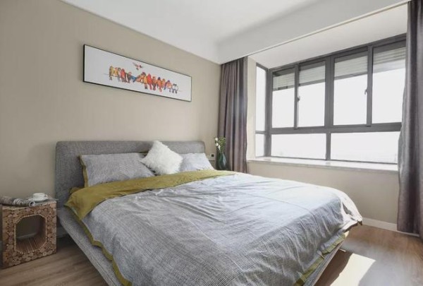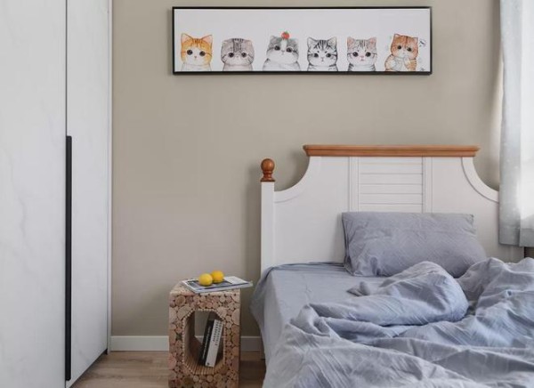 ▲也是珍珠咖色的墙面,床头墙挂一幅横幅猫咪可爱挂画,结合现代优雅的木质床铺,灰色的床单布置,小卧室也是可爱而又活泼惬意。