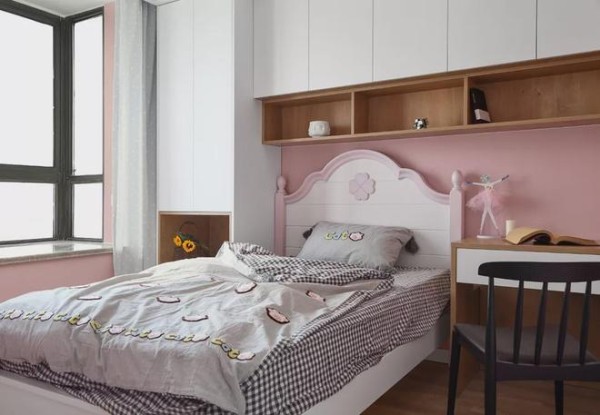 ▲女孩房空间紧凑的基础,粉色床头墙上方装了一排的吊柜,侧边一张书桌与衣柜,中间布置粉白优雅的床铺,小空间也是优雅浪漫而实用。