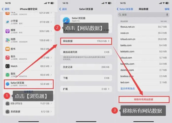 步骤2:在【Safari】页面中,找到【清除历史记录和网站数据】选项,点击进入并确认删除。