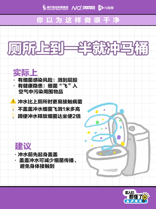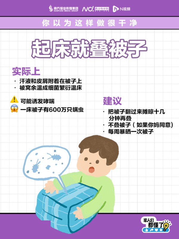 #看似很干净其实巨脏的6种生活习惯#【快住手!起床后,千万别立刻叠被子!】 厕所上到一半就冲马桶、猪肉买回家冲洗干净、开水烫内裤杀菌……生活中,一些行为习惯看似爱干净,其实可能在无形中影响着健康。戳图了解,看看你有没有中招?