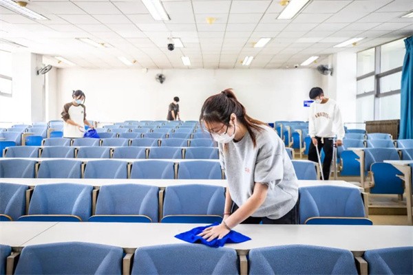 走進天津科技大學校園,每天中午或晚上每間公共教室都會看到學生拿著抹布、掃帚細心打掃衛生,全校219間公共教室無一例外被學生們收拾得乾淨整潔。全體師生參與校園清潔勞動,這是天津科技大學在校內最新推行的一項勞動教育舉措。本科生負責所有公共教室的衛生保潔,研究生負責實驗室的衛生清理,教職工負責辦公區日常打掃,從大一新生到校長全部參與其中。學校希望從日常生活細節入手,人人參與,教師引領示范,讓學生體會到勞動的辛苦和不易,樹立尊重勞動的意識,培育擔當奮進的精神。