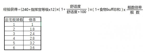 后宅的总经验收益与 舒适度、食物增益、舰船数、指挥官等级有关。 增加槽位,单个舰娘收益降低,但总收益提速(等量食物获得总收益不变)。 没有食物时,获得经验减少到1/4(经验跳动频率减少到1/4) 感谢来自nga用户【大地母亲再忽悠着你】的数据分析 原贴地址。 后宅经验计算器 食物BUFF请写为小数,如5%写为0.05 指挥官等级 舒适度 食物BUFF 舰数 经验加成舒适度与经验加成比