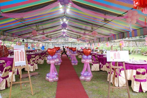 1、五彩缤纷的顶棚绝对是最抢眼的装饰了,让婚礼的喜庆感十足。淡紫和粉色的完美搭配,让这个农村的户外婚礼唯美而大气。红毯也是一个亮点所在。
