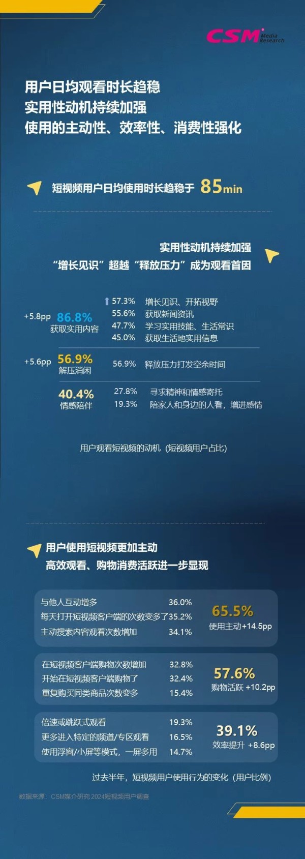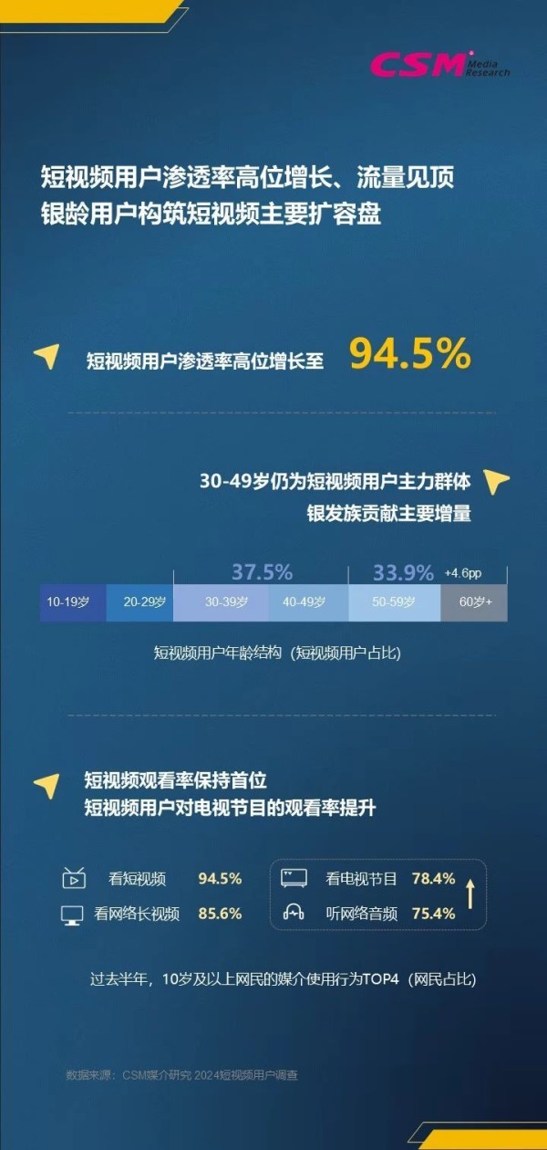 近日,中国广视索福瑞媒介研究(CSM)发布《第七次短视频用户价值年度调研报告》。CSM持续聚焦短视频行业的发展变迁,于2024年8-9月开展了第七次短视频用户年度调查,调查涵盖10岁及以上短视频用户的使用行为、内容偏好、平台使用、电商及内容付费、主流媒体短视频传播等,并对银发类短视频、微短剧等热点垂类内容开展了专项调研。