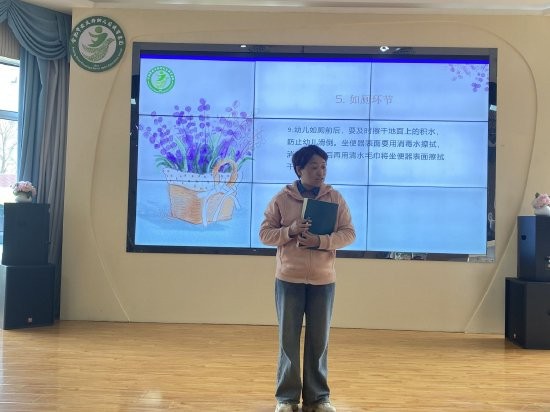 保健老师胡迎年结合本园实际情况,从入园准备、盥洗环节、就餐环节、如厕环节、户外活动、午睡环节、离园环节七个方面进行了全方面的培训,进一步明确了幼儿园一日生活流程各环节的要求,指出了保育员在日常生活中容易疏忽的问题,希望大家以此为契机,做细、做实幼儿园一日生活的各个环节。