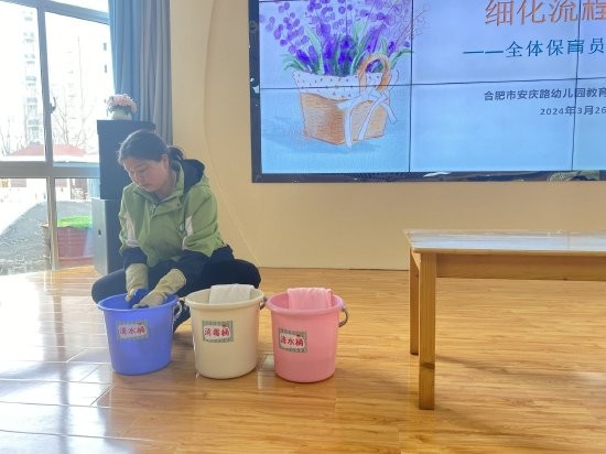 保育员的工作是幼儿园工作的重要组成部分。为了进一步明确保育老师的岗位职责及一日保教工作流程,切实提高保育老师整体的业务能力和岗位技能。2024年3月26日,合肥市安庆路幼儿园桃蹊分园开展了“聚焦一日生活 细化流程管理”为主题的保育老师专题培训。