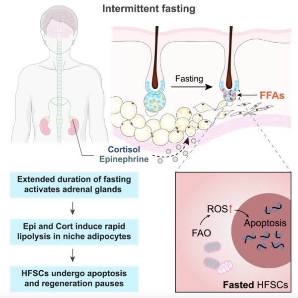 研究结果显示,间歇性禁食对小鼠的毛囊再生,表现出了显著的抑制,机制主要是选择性地诱导激活的 HFSC 的凋亡。