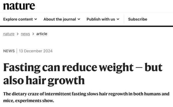 「研究中,间歇性禁食对小鼠的毛囊再生和毛发生长抑制作用明显。但在人的临床实验中情况有些不同,10 天的间歇性禁食只是导致参与者的头发生长速度变缓,并未发现明显脱发现象。」