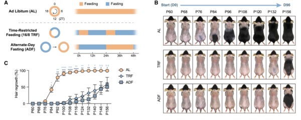 研究团队首先将小鼠的一块区域全部剃毛,然后对这些小鼠进行了两种常用的间歇性禁食方案——16+8 限时饮食(TRF,把进食限制在一天中的 8 小时内,其余时间禁食)和隔日禁食(ADF,24 小时禁食、24 小时无限制进食交替),并以定期自由进食(AL)作为对照组。