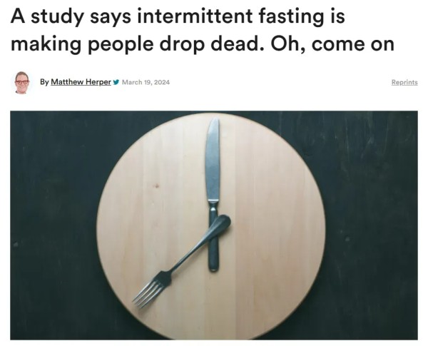 就像增加 91% 心血管疾病风险这一结果曾被全世界媒体争相报道,有些甚至以「长期『16+8』会导致心血管死亡」为题。当时,美国医学资深编辑 Matthew Herper 以一句 「oh, come on(得了吧)」发出嘲讽。