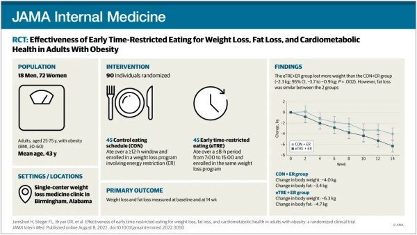 JAMA Internal Medicine 2022 年的一项随机对照临床试验显示,控制在 7:00~15:00 内进食,坚持 14 周后有效减重 6.3kg,还能改善舒张压和情绪紊乱 。另一项随机对照临床试验也表明,糖尿病患者行「16+8」饮食法能显著降低体重和血糖水平。