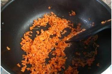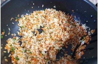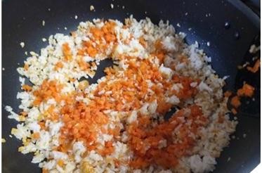 再次取出炒锅,在锅中倒入适量的食用油,然后将准备好的鸭蛋黄置于锅中,当其完全溶解时,就可以加入准备好的白米饭了。进行翻动,使锅中食材能够充分混合,然后后我们就可以倒入步骤1中取出的胡萝卜了。继续进行炒制,几者完全混合。