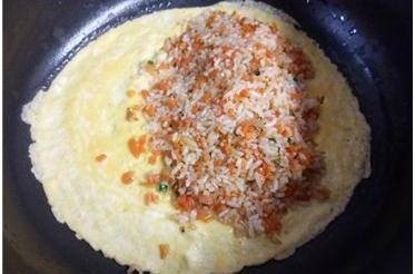 在洁净的碗碟中打入适量的鸡蛋,然后使其蛋黄与蛋清充分融合,取出干燥洁净的平底锅,在倒入适量的食用油,待锅面冒青烟时,将准备好的鸡蛋倒入其中,使其平铺于锅面。待其成型后,我们就可以将上一步骤中准备好的饭倒在其表面,在这里需要提醒的是,为了那个“包”字进行的更完美,我们在选择倒饭时,尽量倒在蛋饼的半边,待鸡蛋完全成熟之后,将另一半蛋饼进行翻折。