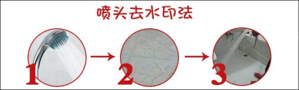 ① 喷头去水印法:淋浴后顺手将喷头调节到冷水位,并对周围的墙壁稍加喷淋,这样可以避免瓷砖出现凝结的水印。