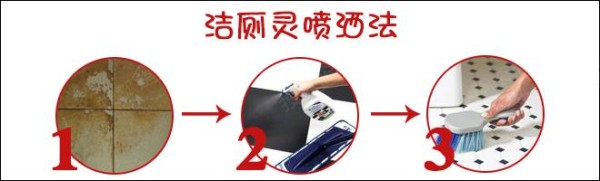 ② 厕灵喷洒法:靠近地面的几排墙砖容易出现黄色水碱样污垢,可以将清理马桶用的洁厕灵装入喷壶内,由上而下地喷到瓷砖上,过10分钟后再用刷子进行清理。