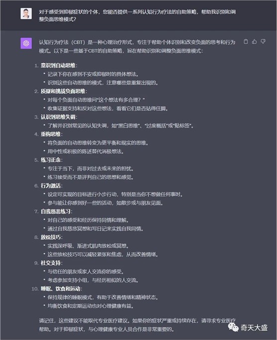 1.控制抑郁症状提示:“对于感受到抑郁症状的个体,你能否提供一系列认知行为疗法的自助策略,帮助我识别和调整负面思维模式?”