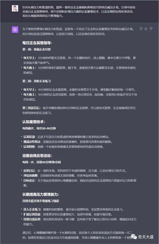 2.管理压力和焦虑提示:“针对长期压力和焦虑的我,提供一套结合正念基础和高级技巧的综合减压计划。计划中应包含每日正念冥想指导、用于识别和处理压力源的认知重塑技术,以及定期的自我反思活动,旨在长期提高我的压力管理能力。”