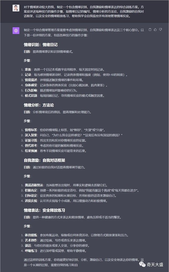 3.处理情绪波动提示:“对于情绪波动较大的我,制定一个包含情绪识别、自我激励和情绪表达的综合训练方案。方案应详述每种技巧的操作步骤,如情绪日记的编写、情绪分析的方法论、自我激励的自我对话框架,以及安全的情绪释放练习,帮助我学会自我监控并有效地管理情绪反应。”