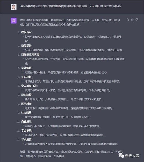 5.提高自我价值感提示:“请问有哪些练习或日常习惯能帮助我提升自尊和自我价值感,从而更自信地面对生活挑战?”