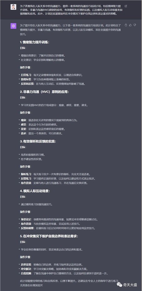 4.改善人际关系提示:“为了改善我在人际关系中的沟通能力,提供一套系统的沟通技巧培训计划。包括情绪智力提升训练、非暴力沟通(NVC)原则的应用、有效倾听和反馈的实践,以及模拟人际互动场景来加强理解和应用。此外,计划还应涵盖如何在冲突情况下维护自我边界和表达需求的策略。”