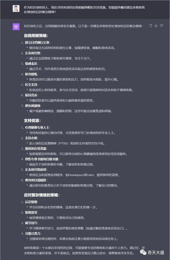 7.处理创伤后应激提示:“作为经历创伤的人,我在寻找有效的自我照顾策略和支持资源。您能提供哪些建议来帮助我处理创伤后的复杂情绪?”