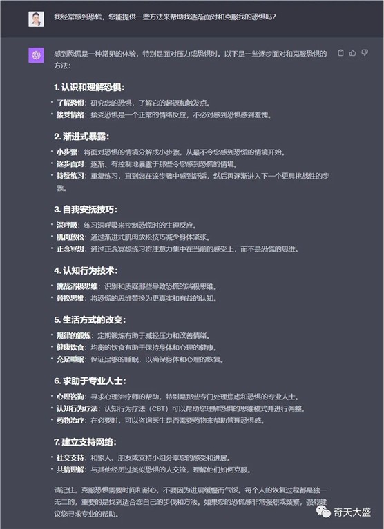 9.克服恐惧和恐慌提示:“我经常感到恐慌,您能提供一些方法来帮助我逐渐面对和克服我的恐惧吗?”