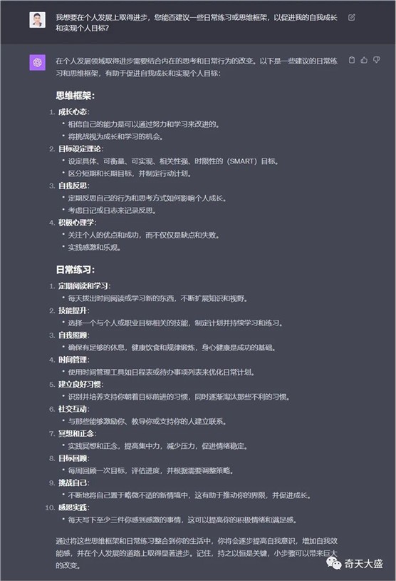 10.自我成长与发展提示:“我想要在个人发展上取得进步,您能否建议一些日常练习或思维框架,以促进我的自我成长和实现个人目标?”