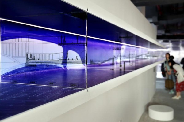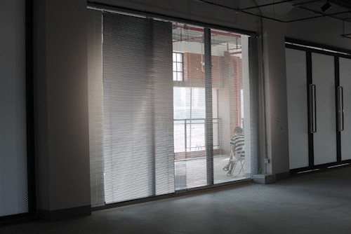 “光的背面”,艺术家通过采集声音来控制百叶窗的开合,此起彼伏,犹如百叶窗与黄浦江窃窃私语。作品对透进展厅内的自然光进行改造和调控,使静止的空间有了光线带来的动感和韵律。