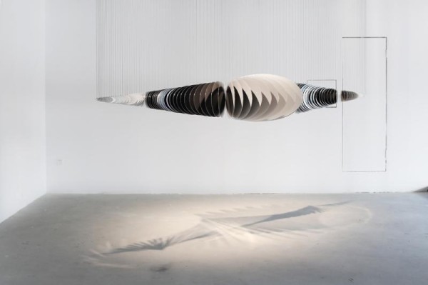 “中心说”,由金属椭圆片悬挂排列构成的艺术装置,中间的圆片在感应到有人靠近时,会水平旋转带动整个双锥体运动,是传递能量与动力的过程。