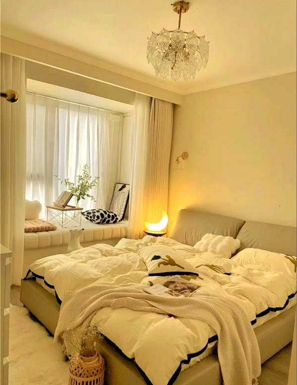 1. 色彩心理学应用 主色调:浅色系(米白、浅灰、淡蓝)反射更多光线 局部点缀:墨绿、脏橘等低饱和度色彩(通过抱枕、挂画实现) 墙面与地面:同色系延伸(减少色彩分割) 2. 镜面与玻璃元素 全身镜:安装在门后或衣柜门板,反射面积扩大1.5倍 玻璃隔断:取代实体墙分隔梳妆区与睡眠区 亚克力床头柜:减少视觉重量 3. 灯光层次设计 基础照明:嵌入式筒灯(间距≤80cm,色温3000K) 重点照明:床头壁灯(距离墙面30cm,亮度≥5W) 氛围照明:灯带嵌入床头背景墙四、多功能家具:小空间的效率革命