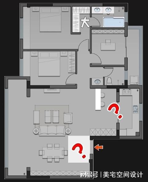 下面我们开看一下业主需求,入户要又一个玄关,厨房空间想要中西分开,还想要又个吧台,主卫内需要一个双盆的浴室柜,还想要添加一个浴缸。衣帽间还想要更大一点。对卧室没有要求,保留两个卧室即可。