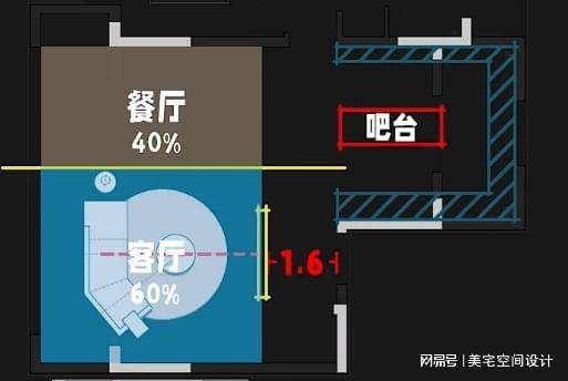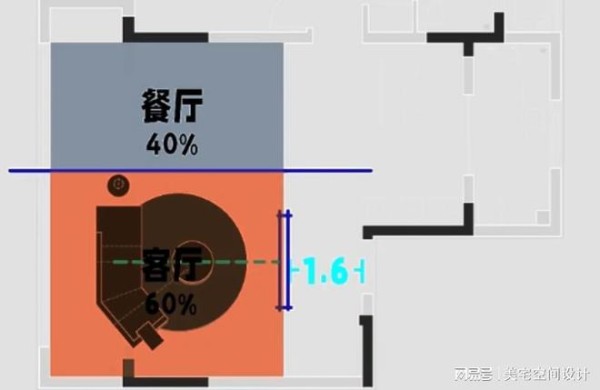 这里我们将原大客厅一分为二,60%分给了客厅,40%分给了餐厅。