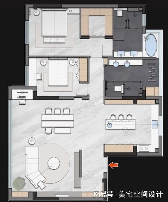 下面我们来看一下改造的全貌吧。重新设计好的户型满足了业主之前的所有需要,扩大了衣帽间,储物增加了75%,卫生间内公卫私卫都做了双台盆的设计。也做了观景浴缸。