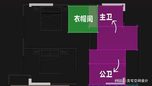 主卧内衣帽间需要扩大的话,就得吃点一点主卫的空间,同时主卫空间我们这里就要和公卫同时吃掉书房来满足空间上的使用。