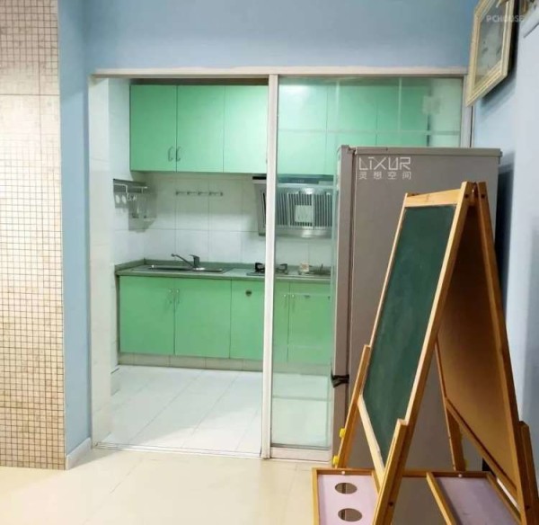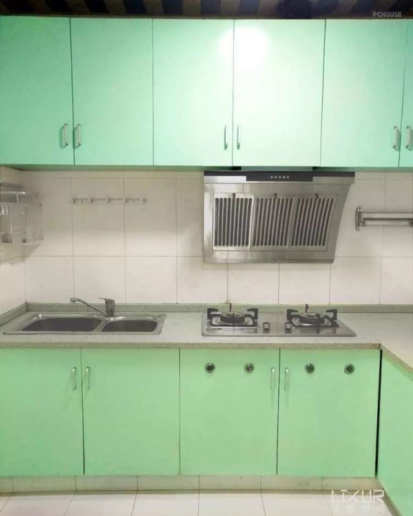 厨房的布置比较简单,放置的都是厨具,颜色的搭配很小清新,上下两个储物柜可以方便放置东西,有很大的利用空间,不会觉得拥挤。