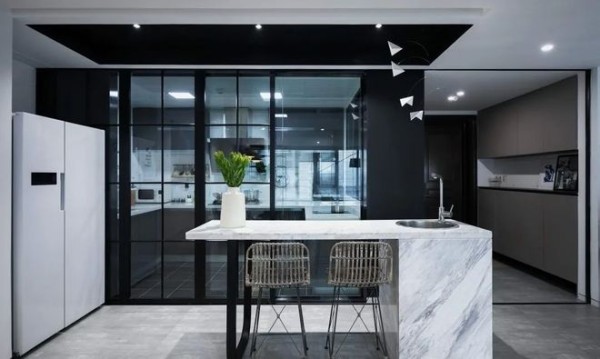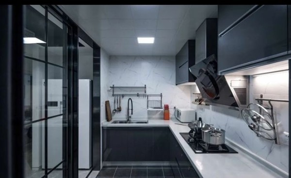 厨房是靠在玄关的旁边,与玄关共用一个三联动超大滑门,搭配灰黑色为主装修风格,显得非常高级又整洁。