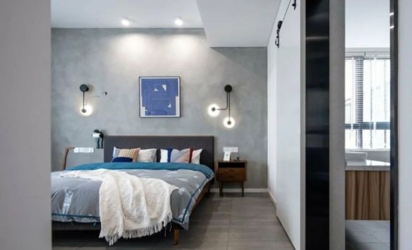 吧台旁边的走廊就是次卧和主卧了,主卧在最内侧。主卧也主要以冷色系为主,搭配墙上的挂画和不对称的壁灯,生活质感立马提升。卧室还设计了卫生间和衣帽间,卧室的基本功能都得到了满足。