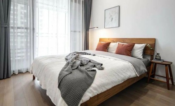 次卧选择了比较柔和的木色系家具,搭配柔和灯光线的落地灯,整体空间简洁却又不失设计感。