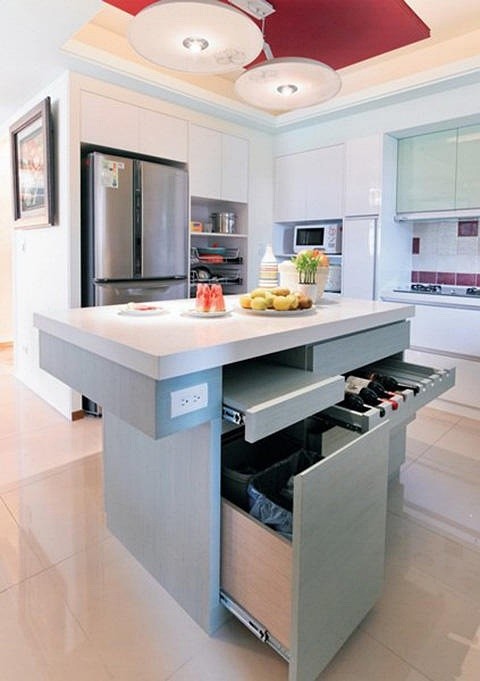 料理过程中,免不了会产生厨余、垃圾,为减少垃圾滴水、掉落而污染厨房的机率,如果空间足够的话,建议在料理台下方的空间放置垃圾桶,可当作当日垃圾丢弃用。