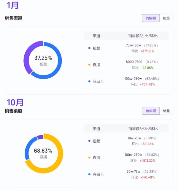 而在1月,带货直播的销售额占比几乎为0,主要由商品卡和带货视频组成。此外,1月和10月的带货方式均为达人推广为主。
