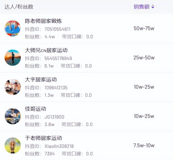 但在而在10月,品牌的推广方向改变,从达人昵称可直观看出,这类达人账号定位聚焦于“居家健身”这一细分赛道,同时从粉丝量级上来看,主要有潜力达人以及腰部达人组成。