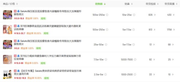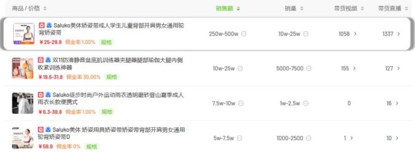 在24年上半年,「SALUKO」主要推广其下的“美体矫正带”,关联的带货视频、带货直播均达上千个,销售额排名TOP1的“矫正带”单品占品牌24年h1的销售额近9成。
