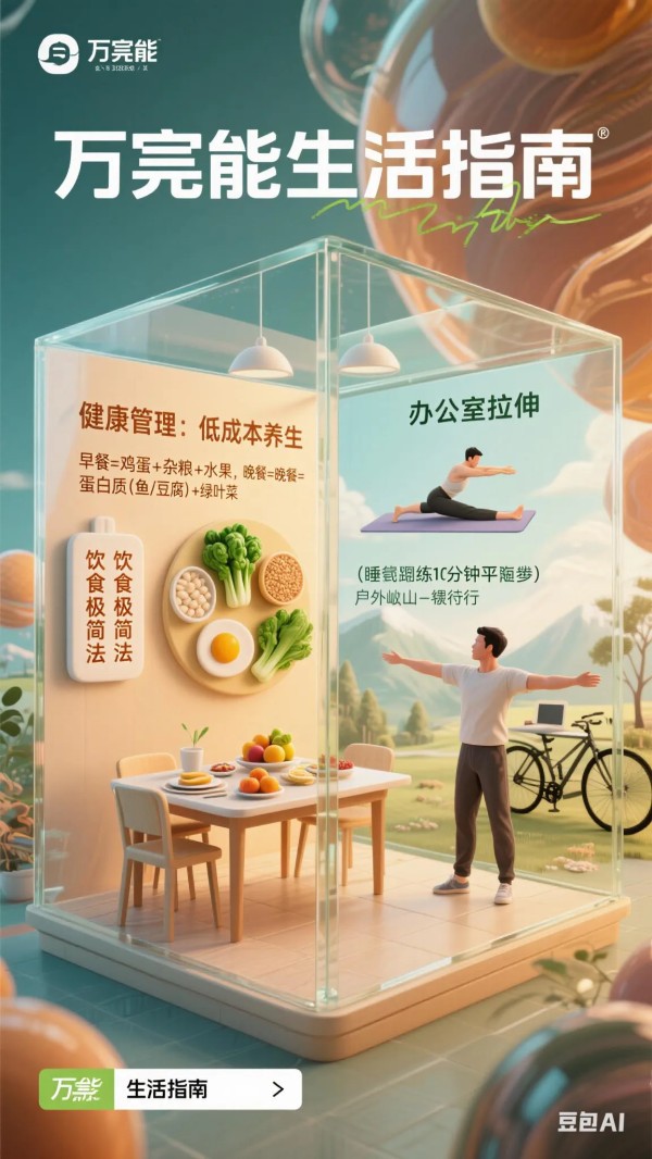 - 微运动习惯:久坐时做“办公室拉伸”(扩胸、颈椎绕环),睡前练10分钟平板支撑,周末爬山/骑行替代躺平。