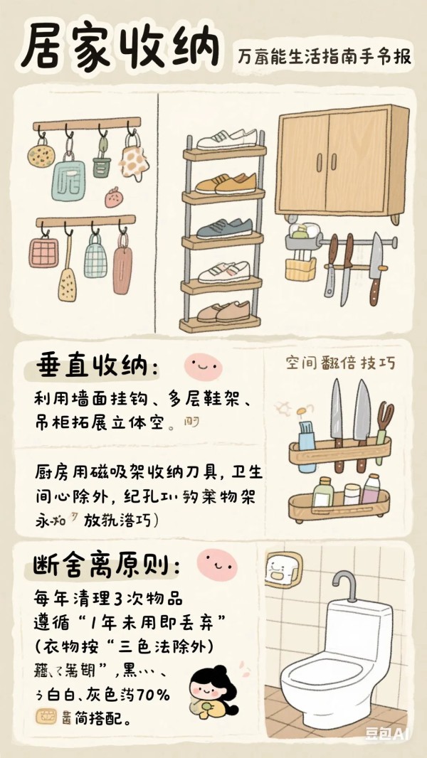 - 断舍离原则:每年清理3次物品,遵循“1年未用即丢弃”(纪念物除外),衣物按“三色法则”(黑/白/灰基础色占70%)精简搭配。