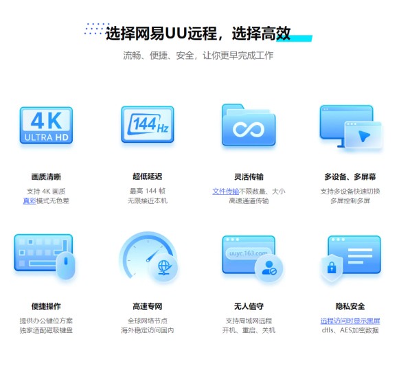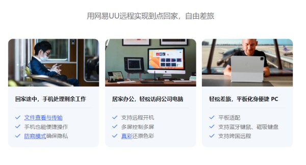 网易UU远程是一款由网易出品的专业远程控制软件。支持手机、平板、Mac 、PC、TV 与掌机等多设备远控电脑,满足远程游戏、办公和协助需求。凭借高速直连和超低延迟,提供流畅的本地操控体验,支持真彩、 HDR 、4K、144 帧画面显示,支持远程开机、多屏协作、高速文件传输,同时兼容键鼠、手柄和多点触控,让用户不仅可以高效办公也能快乐游戏。