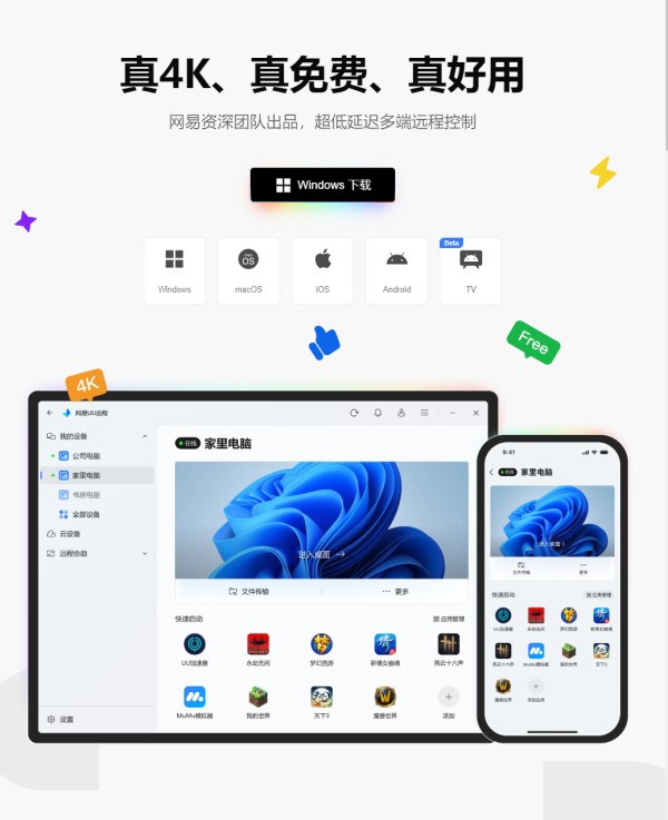 在多设备协同日益普及的今天,高效、流畅的远程控制已成为工作与生活的刚需。网易出品的这款免费远程控制软件,凭借低延迟、高画质与跨平台兼容性,轻松实现手机、平板、Mac、PC、TV 乃至掌机对电脑的远程操控,让自由办公与畅快娱乐触手可及。